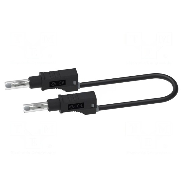 Konstrukcja przewodu obejmuje wtyki bananowe 4mm umieszczone po obu stronach, które wyposażono w gniazda osiowe 4mm oraz izolację. Produkt przystosowany jest do pracy z napięciem znamionowym 0,6kV. Zgodność z normą EN 61010 oraz kategoria pomiarowa CAT II 600V potwierdzają parametry użytkowe akcesorium w kolorze czarnym.
