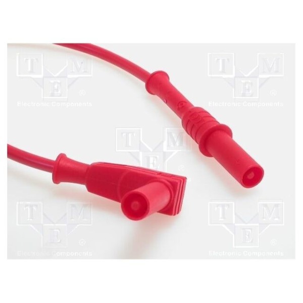 Przewód pomiarowy w kolorze czerwonym został zaprojektowany do pracy z napięciem znamionowym do 1kV oraz prądem do 20A. Konstrukcja elementu obejmuje wtyk bananowy 4mm oraz wtyk bananowy kątowy 4mm, co ułatwia połączenia w układach pomiarowych. Przewód posiada przekrój 1mm² i jest przystosowany do pracy w zakresie temperatur od -20 do 80°C.