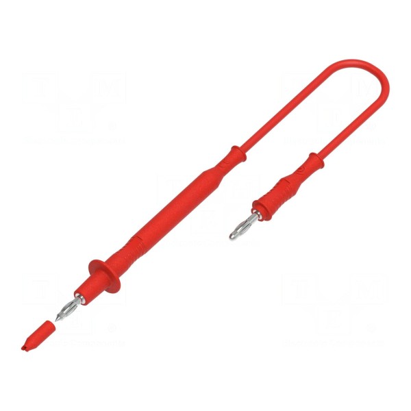 Przewód pomiarowy o długości 1m wyposażony w końcówkę pomiarową oraz wtyk bananowy o średnicy 4mm. Element przystosowany jest do pracy przy napięciu znamionowym 30V AC oraz 60V DC, przy maksymalnym natężeniu prądu wynoszącym 12A. Konstrukcja przewodu o przekroju 0,75mm² wykorzystuje izolację wykonaną z PVC.