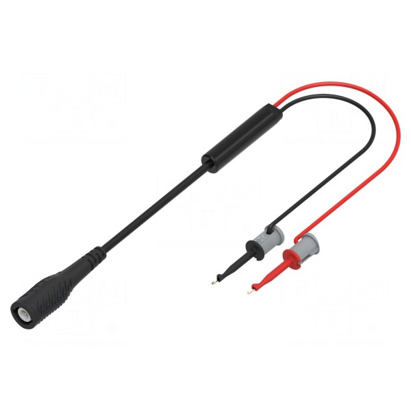Przewód pomiarowy o długości 2 metrów został wyposażony w złącze typu wtyk BNC oraz dwa chwytaki haczykowe. Element charakteryzuje się impedancją wynoszącą 50Ω oraz prądem znamionowym 3A. Komponent jest przeznaczony do pracy przy napięciu znamionowym do 30V AC oraz 60V DC.