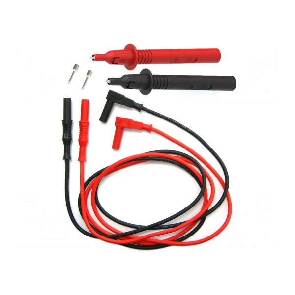 W zestawie znajdują się dwa przewody o długości 1,5m zakończone wtykiem bananowym 4mm oraz końcówką pomiarową, a także dwie sondy pomiarowe. Produkt dostępny jest w kolorystyce czarnej i czerwonej.