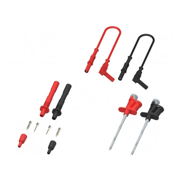 Zestaw przewodów pomiarowych 425 marki ELECTRO-PJP obejmuje elementy w kolorze czarnym oraz czerwonym. Komplet pozwala na konfigurację połączeń pomiarowych za pomocą dołączonych akcesoriów.