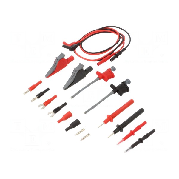 Zestaw zawiera przewody pomiarowe w kolorach czarnym i czerwonym, przeznaczone do wykonywania połączeń w układach pomiarowych. Elementy zestawu wykonano z uwzględnieniem standardów bezpieczeństwa IEC.