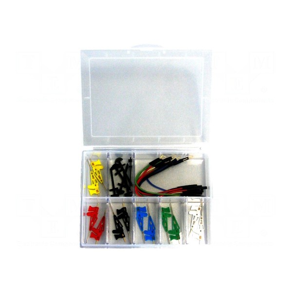 Zestaw zawiera cęgowe chwytaki pomiarowe o długości całkowitej 42,6 mm. Elementy te charakteryzują się prądem znamionowym 0,5 A oraz napięciem znamionowym wynoszącym 60 V DC i 30 V AC. Konstrukcja pozwala na współpracę z gniazdami o rozmiarze 0,8 mm oraz umożliwia chwytanie przewodów o maksymalnej średnicy 0,6 mm.