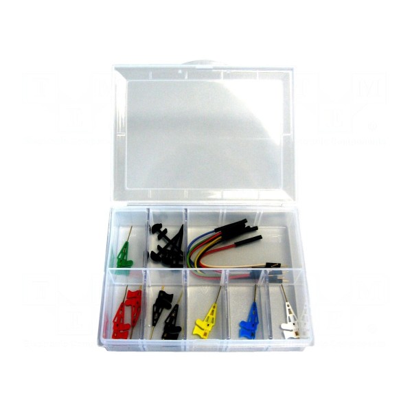 Akcesoria dostępne są w zestawie obejmującym szeroką gamę kolorystyczną: biały, czarny, czerwony, niebieski, zielony oraz żółty. W zestawie: chwytaki pomiarowe x8, plastikowe pudełko, przewód połączeniowy x8, uchwyt x4.
