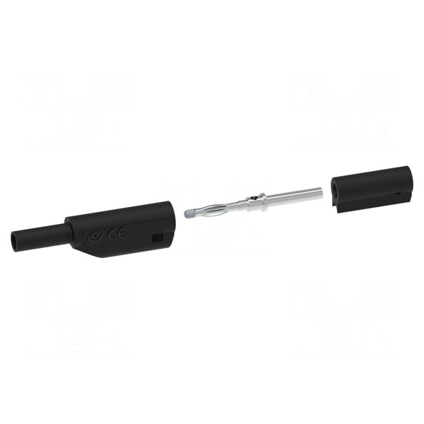 Złącze laboratoryjne typu wtyk bananowy 2mm w kolorze czarnym. Komponent przeznaczony do połączeń w układach pomiarowych.