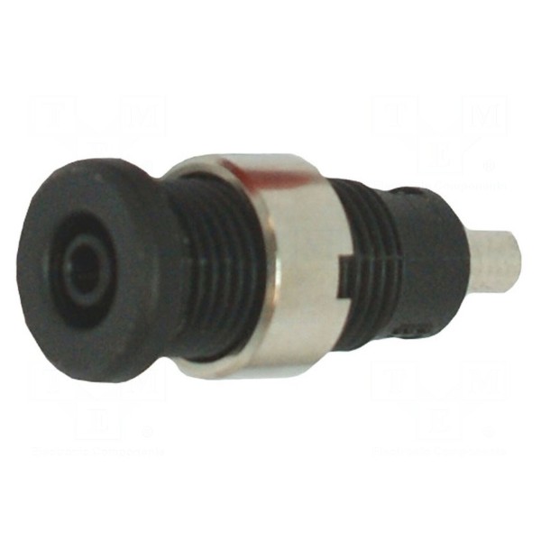 Złącze laboratoryjne typu bananowego o średnicy 2mm w wersji izolowanej. Element wyposażony jest w gniazdo i charakteryzuje się czarnym wykończeniem izolacji.