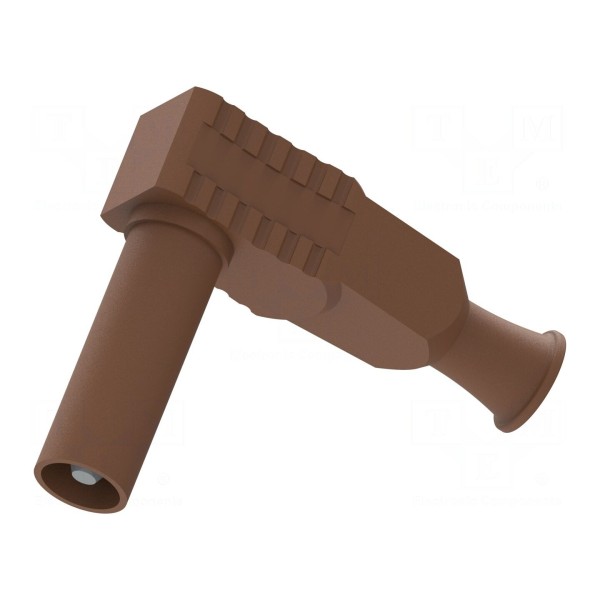Złącze laboratoryjne typu bananowego o średnicy 4mm przeznaczone jest do montażu na przewód. Produkt charakteryzuje się prądem znamionowym 20A oraz posiada izolowaną obudowę w kolorze brązowym.