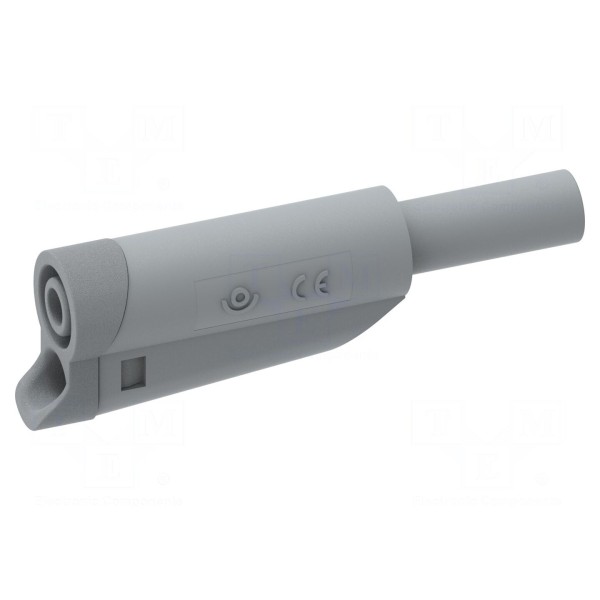 Element charakteryzuje się prądem znamionowym 36 A oraz zgodnością z normami bezpieczeństwa, w tym CAT II 1000V AC, CAT II 1500V DC, CAT III 1000V oraz CAT IV 600V. Całkowita długość wtyku wynosi 59 mm, a jego konstrukcja w kolorze szarym umożliwia łatwą identyfikację w układach pomiarowych.