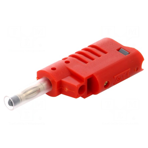 Wtyk został wykonany z mosiądzu z niklowaną powierzchnią styku, co wpływa na parametry połączenia. Konstrukcja posiada izolację oraz montaż typu M3, a całkowita długość elementu wynosi 58,6 mm. Produkt występuje w kolorze czerwonym.