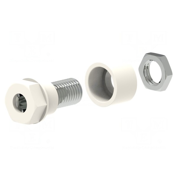 Styki złącza wykonano z mosiądzu i poddano procesowi niklowania, co zapewnia trwałe połączenie elektryczne. Montaż elementu odbywa się za pomocą gwintu M6. Całkowita długość złącza wynosi 17,5mm, a oferowana wersja dostępna jest w kolorze białym.