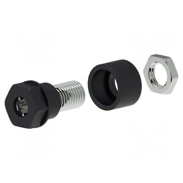 Konstrukcja posiada niklowane styki wykonane z mosiądzu, co zapewnia przewodność w standardowych warunkach pracy. Jest to wersja izolowana, przystosowana do montażu typu M6 o łącznej długości 17,5mm. Produkt wykończony w kolorze czarnym.