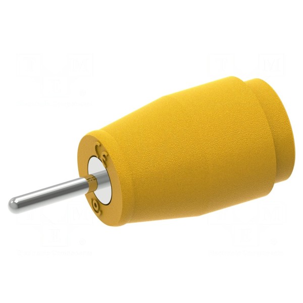 Styk wykonany z mosiądzu został poddany procesowi niklowania, co zapewnia trwałość połączenia. Komponent spełnia wymogi bezpieczeństwa zgodne z normą CAT III 1000V, co umożliwia jego zastosowanie w warunkach laboratoryjnych i pomiarowych. Produkt dostępny jest w kolorze żółtym.