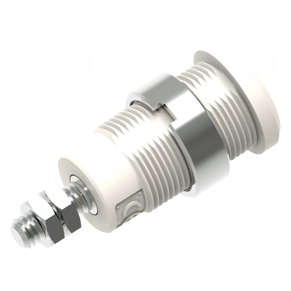Konstrukcja złącza obejmuje niklowane pokrycie styku oraz izolowaną obudowę w kolorze białym. Element przeznaczony jest do montażu na panelu przy użyciu połączenia przykręcanego z zaciskiem śrubowym.