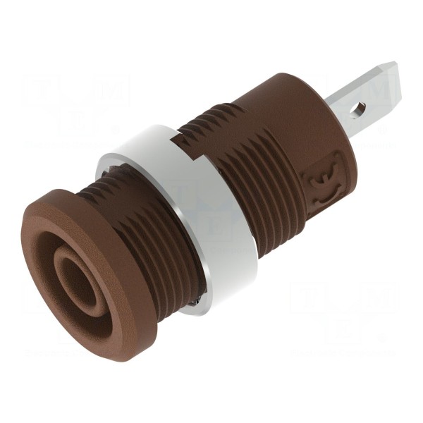 Złącze laboratoryjne typu gniazdo bananowe 4mm w kolorze brązowym przeznaczone jest do montażu typu faston. Produkt charakteryzuje się izolowaną konstrukcją zapewniającą wymagany poziom ochrony przy pracy z obwodami elektrycznymi.