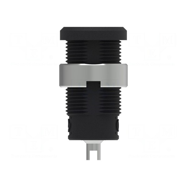 Styk gniazda posiada pokrycie niklowane, co zapewnia połączenie elektryczne. Montaż komponentu odbywa się poprzez lutowanie oraz przykręcenie do panelu docelowego. Produkt wykonany jest w kolorze czarnym.
