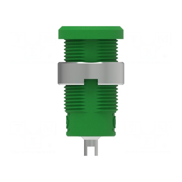 Styk gniazda został poddany procesowi niklowania, co zapewnia trwałość połączenia. Element przystosowany jest do montażu na panelu poprzez przykręcanie lub lutowanie. Produkt jest zgodny z normą bezpieczeństwa CAT III 1000V, a jego kolor to zielony.