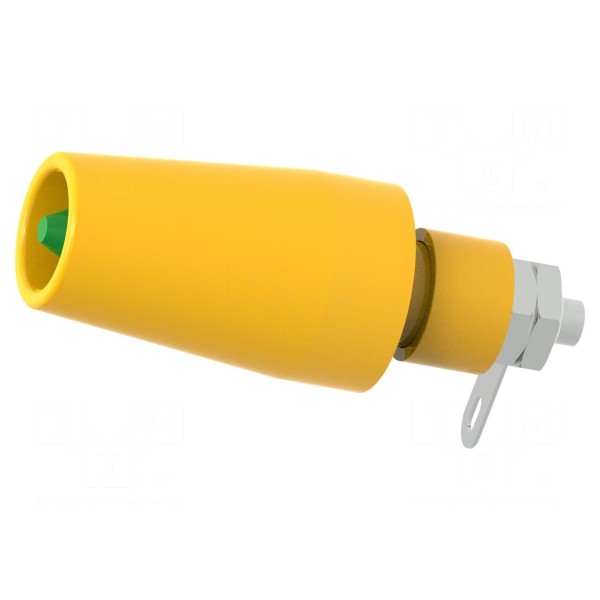 Element spełnia wymogi bezpieczeństwa określone normą CAT II 600V. Całkowita długość wtyku wynosi 44,8mm, a kolor korpusu to żółto-zielony.
