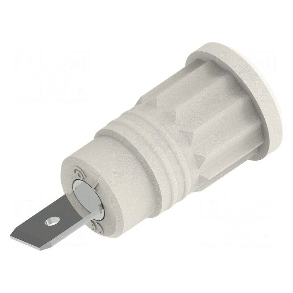 Złącze laboratoryjne typu gniazdo bananowe 4mm przeznaczone jest do montażu metodą faston. Komponent został wykonany z mosiądzu z niklowanym pokryciem styków, co zapewnia parametry przewodzenia dla prądu znamionowego o natężeniu 36A. Element występuje w izolowanej wersji o kolorze białym.