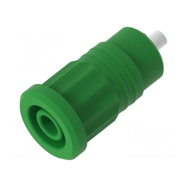 Styki złącza wykonane są z mosiądzu i poddane procesowi niklowania, co wpływa na ich parametry eksploatacyjne. Element o długości całkowitej 28,2mm montowany jest za pomocą otworu lutowniczego o średnicy 2mm. Produkt dostępny jest w kolorze zielonym.