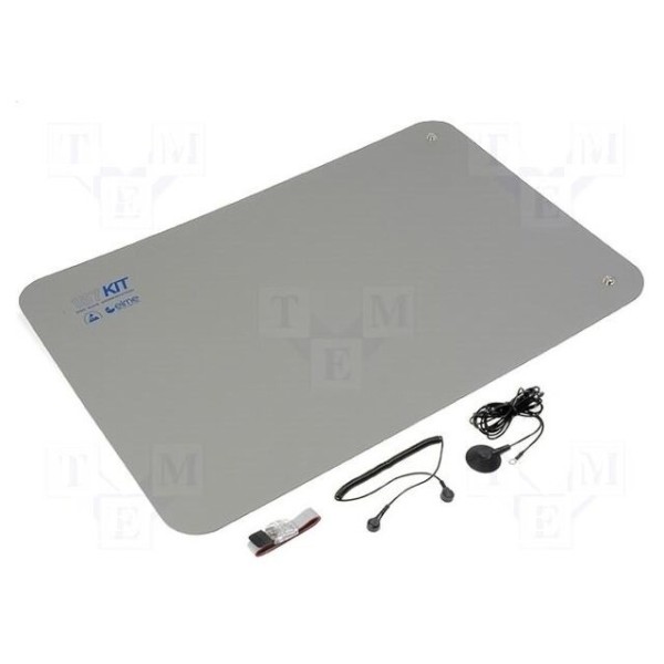 W zestawie znajduje się mata antystatyczna wyposażona w dwa zatrzaski męskie 10mm, opaska na rękę z zatrzaskiem męskim 4mm, przewód spiralny o długości po rozciągnięciu 1,8m oraz przewód uziemiający o długości 3m. Przewód spiralny zakończony jest zatrzaskami żeńskimi 4mm i 10mm, natomiast przewód uziemiający posiada zatrzask żeński 10mm i końcówkę oczkową Ø5,3mm. Obie linki wyposażone są w rezystancję 1MΩ.