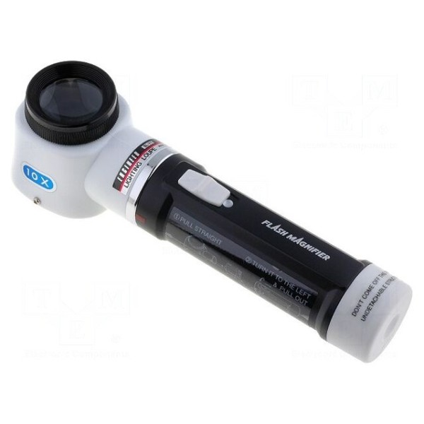 Lupa ręczna o powiększeniu x10 wyposażona jest w soczewkę o średnicy 30mm. Urządzenie posiada zintegrowane podświetlenie typu LED, które poprawia widoczność obserwowanego obszaru w warunkach słabego oświetlenia.