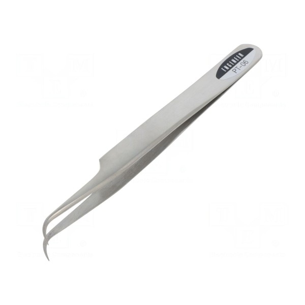 Pęseta o długości 120 mm wykonana została ze stali nierdzewnej. Narzędzie wyposażone jest w zagięte ostrza o ostrym zakończeniu, co umożliwia chwytanie drobnych elementów.