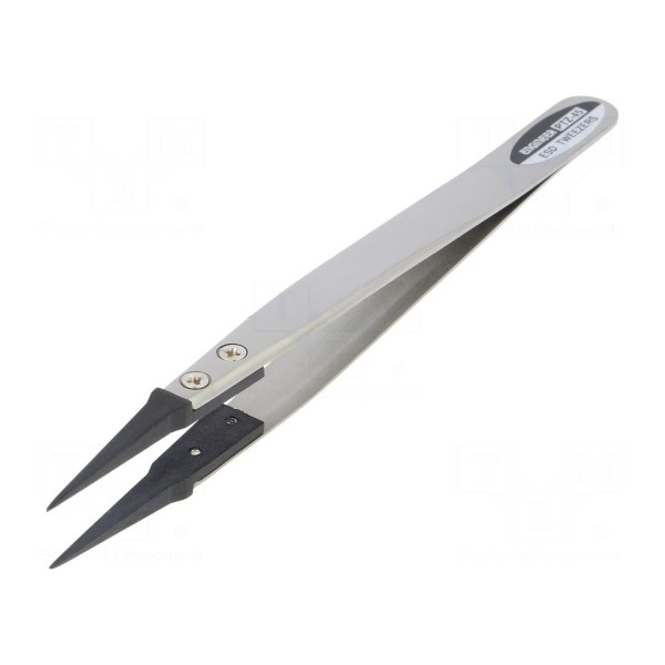 Pęseta prosta o długości 130 mm została wykonana z wyważonym naciskiem na funkcjonalność w środowiskach wymagających ochrony przed wyładowaniami elektrostatycznymi. Narzędzie wyposażono w ostre, wąskie końcówki o szerokości 0,4 mm, co umożliwia precyzyjną manipulację drobnymi elementami.