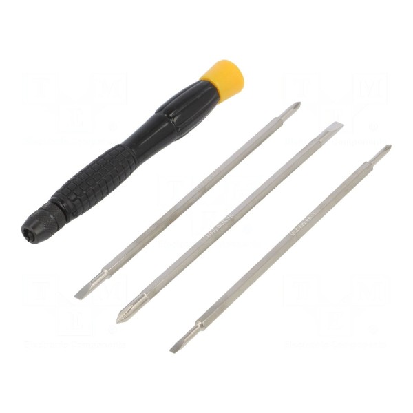 Zestaw zawiera wkrętak precyzyjny z wymiennymi końcówkami typu Phillips oraz płaskiego. W skład kompletu wchodzą groty w rozmiarach PH0, PH00, SL 2,5, SL 3 oraz SL 4, co umożliwia dopasowanie narzędzia do różnych typów śrub.