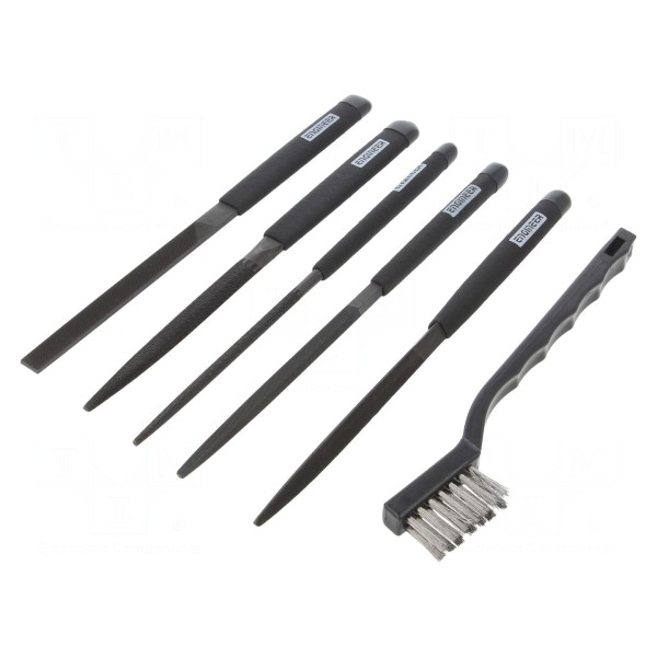 Zestaw zawiera pięć sztuk pilników typu tarnik o różnych kształtach przekroju: kwadratowym, okrągłym, płaskim, półokrągłym oraz trójkątnym. Długość części roboczej każdego z narzędzi wynosi 100 mm, natomiast ich długość całkowita to 215 mm. Konstrukcja narzędzi została przystosowana do prac precyzyjnych, korekcyjnych, montażowych oraz wykończeniowych.