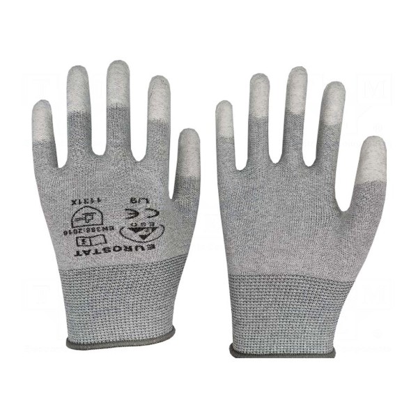 Rękawice ochronne ESD przeznaczone do pracy w strefach cleanroom klasy ISO 7. Wykonane z mieszanki poliestru, poliuretanu, spandexu oraz włókien węglowych, zapewniają rezystancję powierzchniową poniżej 1GΩ. Charakteryzują się właściwościami rozpraszającymi oraz posiadają powłokę poliuretanową na części palców. Produkt jest zgodny z normą IEC 61340-5-2. Wymiary rękawic wynoszą 195mm długości oraz 85mm szerokości. Rękawice w kolorze szarym dostępne są w rozmiarze XS.