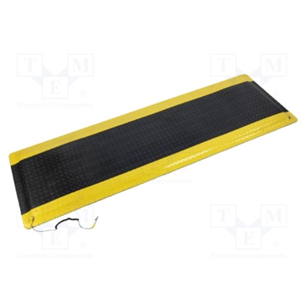 Mata podłogowa antyzmęczeniowa w wersji ESD o wymiarach 1,84m długości, 0,61m szerokości oraz 16mm grubości. Produkt został zaprojektowany w kolorystyce czarno-żółtej, co zwiększa jego widoczność w miejscu pracy.