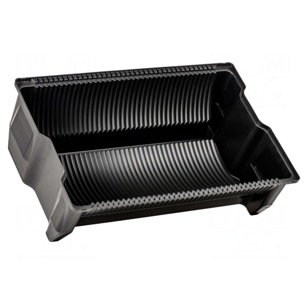Pojemnik w kolorze czarnym posiada zewnętrzne wymiary 560x365x174mm. Pozwala na składowanie maksymalnie 39 szpul o średnicy do 330 mm, co ułatwia organizację przestrzeni roboczej przy produkcji wykorzystującej elementy SMD.