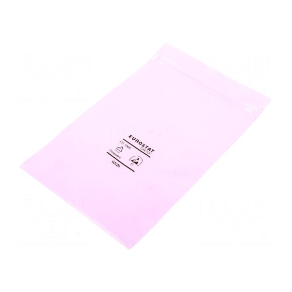 Parametry elektryczne torebki obejmują rezystancję powierzchniową mniejszą niż 100 GΩ. Materiał, z którego wykonano produkt, jest w kolorze różowym. Torebka jest zgodna z wymaganiami normy IEC 61340-5-1, co potwierdza jej przydatność w środowiskach wymagających ochrony przed wyładowaniami elektrostatycznymi.