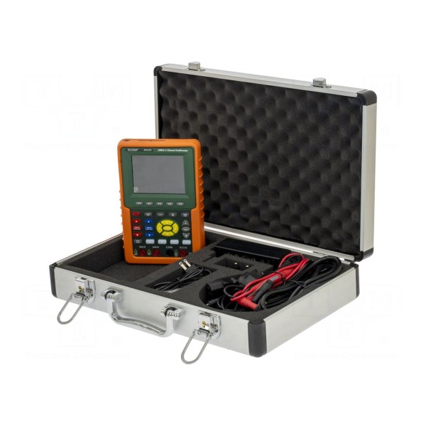 Urządzenie o wymiarach 180x113x40mm zasilane jest akumulatorem Li-Ion. W zestawie: ładowarka/zasilacz, przewody pomiarowe, sonda oscyloskopowa (1 na kanał), walizka oraz wkrętak strojeniowy.