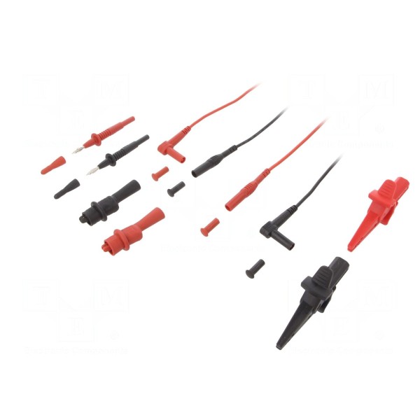 Zestaw zawiera przewody pomiarowe o długości 1m, zakończone po obu stronach wtykami typu banan 4mm. Akcesoria zostały wykonane zgodnie z normami bezpieczeństwa CAT III 1000V oraz EN 61010, co pozwala na bezpieczne wykorzystanie w pracach pomiarowych w instalacjach elektrycznych.