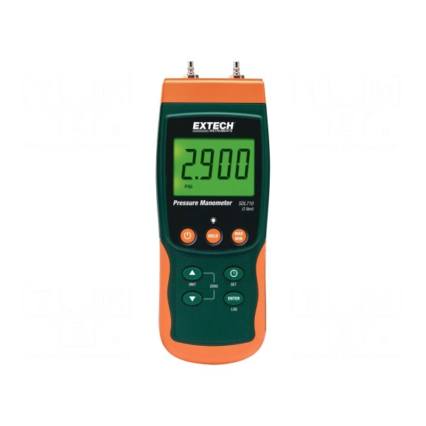 Rejestrator danych Extech SDL710 służy do pomiaru różnicy ciśnień w zakresie od 0,1 do 200 mbar. Urządzenie pozwala na odczyt wartości w wielu jednostkach, w tym atm, hPa, in Hg, in H2O, kg/cm², kPa, mbar, m H2O, mm Hg oraz psi. Rozdzielczość pomiaru wynosi 0,1 mbar, przy dokładności na poziomie ±2%.