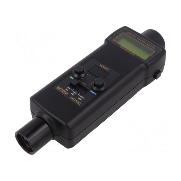 Tachometr marki Extech służy do pomiaru prędkości obrotowej w zakresie od 0,2 do 6560ft/min. Urządzenie jest zasilane czterema bateriami typu AA o napięciu 1,5V.