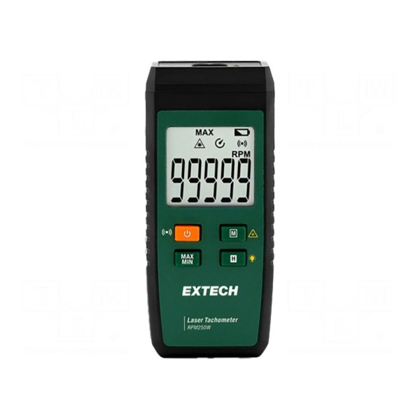 Tachometr EXTECH RPM250W umożliwia optyczny pomiar prędkości obrotowej w zakresie od 10 do 99999 obr./min. Urządzenie charakteryzuje się rozdzielczością pomiarową na poziomie 0,1 obr./min oraz dokładnością wynoszącą ±0,04%. Wyniki prezentowane są na wyświetlaczu LCD wyposażonym w funkcję podświetlenia.