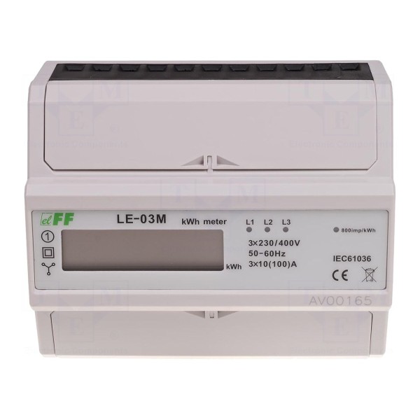Cyfrowy licznik energii elektrycznej F&F LE-03M przeznaczony jest do bezpośredniego pomiaru energii czynnej w sieciach trójfazowych czteroprzewodowych. Urządzenie pracuje z prądem znamionowym 10A oraz prądem maksymalnym 100A przy częstotliwości 50Hz. Konstrukcja przystosowana jest do montażu na szynie DIN, a dane pomiarowe prezentowane są na wyświetlaczu LCD.