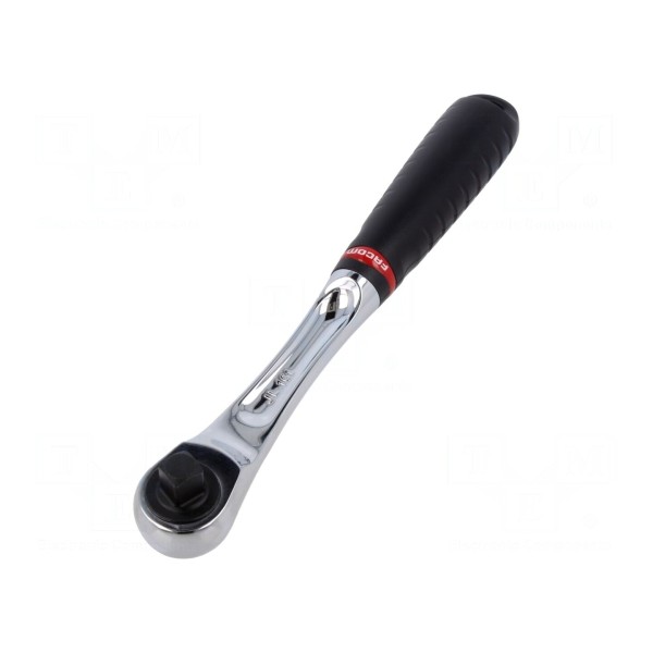 Klucz typu grzechotka marki FACOM przystosowany jest do obsługi nasadek z gniazdem w rozmiarze 3/8". Konstrukcja narzędzia opiera się na mechanizmie zapadkowym wyposażonym w 72 zęby, co pozwala na pracę z niewielkim kątem wychylenia.