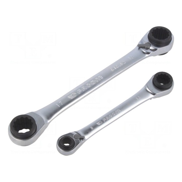 Konstrukcja narzędzi umożliwia pracę w miejscach o ograniczonej przestrzeni dzięki zastosowaniu mechanizmu grzechotkowego. Zestaw składa się z 2 sztuk kluczy.