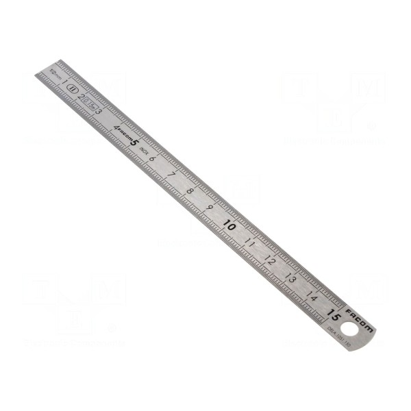Przymiar marki FACOM charakteryzuje się długością wynoszącą 150 mm. Narzędzie zostało wykonane ze stali nierdzewnej, co zapewnia odporność na korozję podczas codziennego użytkowania.