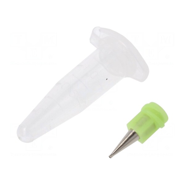 Konstrukcja produktu zapewnia niższe opory przepływu w porównaniu do klasycznych igieł dozowniczych. Korpus dyszy wyróżnia się zielonym kolorem, a jej parametry konstrukcyjne dostosowane są do pracy z dozownikami oraz strzykawkami.