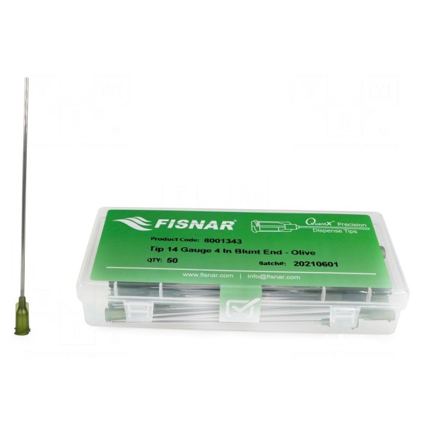 Igła dozująca FISNAR 8001343 została wykonana ze stali oraz wyposażona w korpus z polipropylenu o oliwkowym zabarwieniu. Element charakteryzuje się prostym kształtem, długością 4 cali oraz średnicą wewnętrzną wynoszącą 1,6 mm. Zastosowany standard mocowania Luer Lock zapewnia kompatybilność z szeroką gamą dozowników.