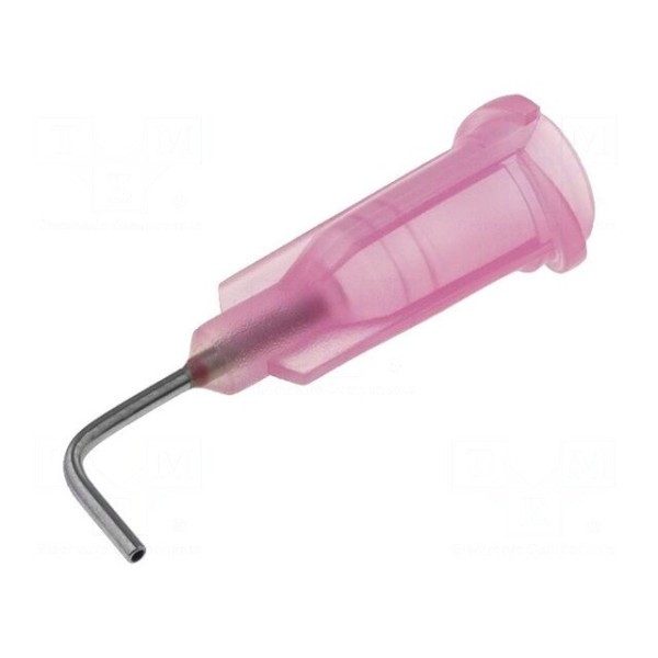 Igła dozująca o rozmiarze 20 przeznaczona jest do współpracy z dozownikami. Konstrukcja elementu składa się ze stalowej igły o średnicy wewnętrznej 0,6 mm oraz korpusu wykonanego z polipropylenu w kolorze różowym. Zastosowanie zagięcia pod kątem 90° ułatwia aplikację w miejscach o ograniczonym dostępie.