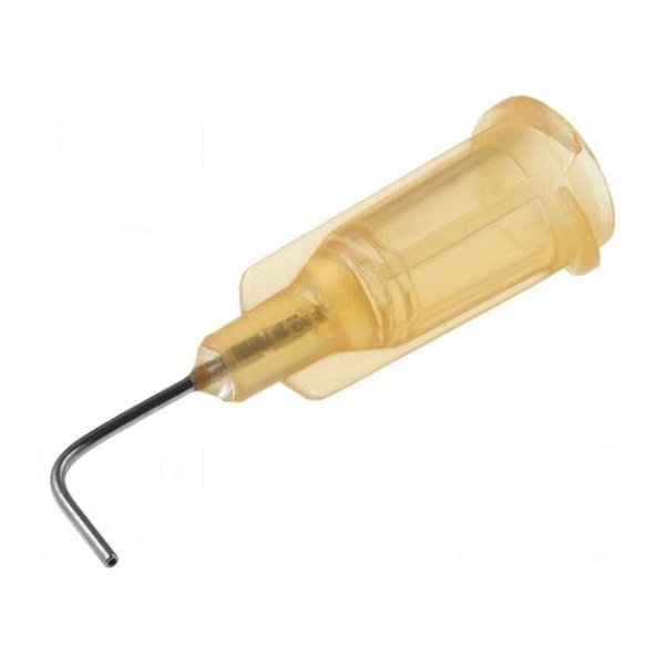 Igła dozująca wykonana ze stali o rozmiarze 23, wyposażona w zagięty pod kątem 90° korpus z polipropylenu w kolorze pomarańczowym. Element charakteryzuje się średnicą wewnętrzną wynoszącą 0,33 mm oraz długością 0,5 cala. Konstrukcja igły jest uszczelniona klejem epoksydowym i przeznaczona jest do jednorazowego użytku.