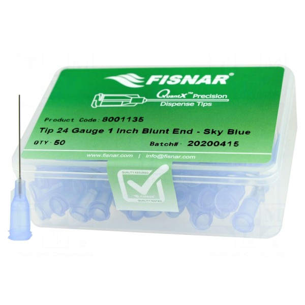 Igła dozująca o rozmiarze 24 wykonana ze stali z korpusem z polipropylenu w kolorze jasnoniebieskim. Element posiada prosty kształt oraz średnicę wewnętrzną wynoszącą 0,31 mm, co pozwala na precyzyjne nanoszenie substancji w systemach dozowania.