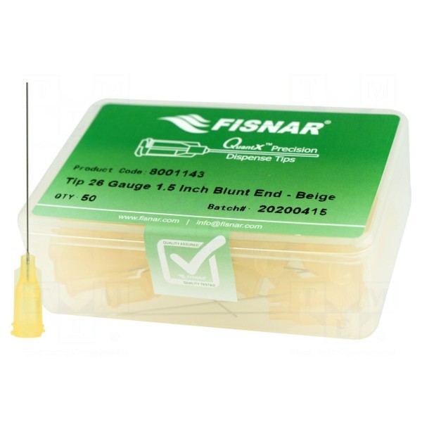 Parametry techniczne obejmują rozmiar 26 przy średnicy wewnętrznej 0,23 mm oraz długość 1,5 cala. Jest to produkt jednorazowego użytku, w którym igła została uszczelniona klejem epoksydowym.