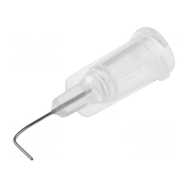 Igła dozująca o rozmiarze 27 wykonana ze stali z korpusem z polipropylenu. Element charakteryzuje się wewnętrzną średnicą 0,2 mm oraz zagiętym pod kątem 90° kształtem, co ułatwia precyzyjne nanoszenie substancji w miejscach o utrudnionym dostępie. Długość całkowita wynosi 0,5 cala.